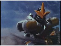 Super Zeozord Three takes flight, retreating into the sky from whence it came. |