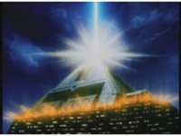 Blackened pyramid, tip shining skyward, decloaks to reveal Pyramidas, shimmering golden. |