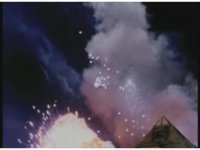 In Pyramidas cockpit, rapid flashing occurs off-frame, as Gold shields his face, briefly leaning against console table, before resuming. |