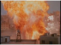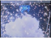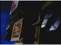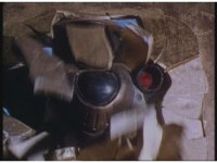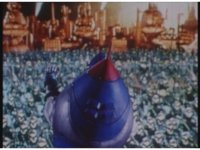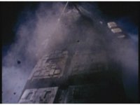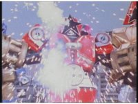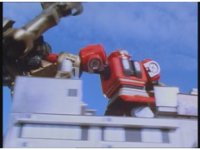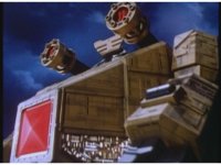 Red Battlezord is launched from cannon at Zord hangar, into a speeding twirl through the sky. |