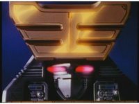 Close-up on Zeo Megazord's head as the Zeozord Five Battle Helmet slides down over it, flashing happening just off-frame. |