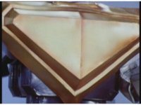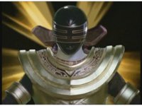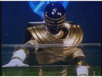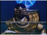 Close, pan down, showing Super Zeozord Three's golden chest triangle, and golden left hip and left thigh. |