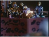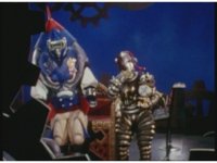 As Louie Kaboom talks into microphone, Klank, with Orbus, comes around and holds it for him, until he walks off, prompting Klank to nervously play with mic for a moment. |