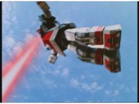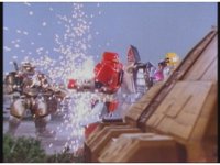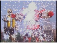 Close on Red Battlezord, firing a barrage of golden bolts from both of its fist gauntlets. |