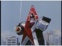 Red Battlezord, spins through the sky, as a red streak beams in upon it. |