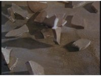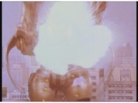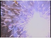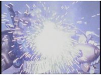 Close on Midas Monster spark bursting even more some more, causing a piece of his armor to fall off and explode. |