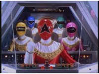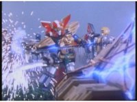 Close on Red Zeo Ranger nod-talking, zoom out to reveal he's in the front seat of the crowded Zeo Megazord cockpit, his four teammates behind him all motioning their right hands up into the air at once. |