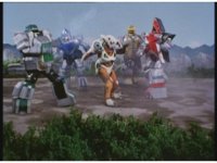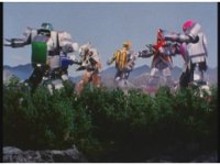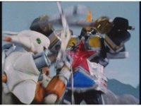 The five Super Zeozords fly forth at us in close formation, energy beams hitting all but Five's head. |