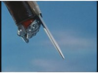 Sharp zoom out as Super Zeo Megazord whips out twin blades, sparkily breaks boomerang, cuts cord, then slashes monster. |