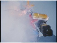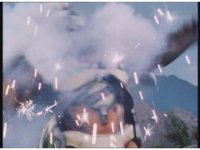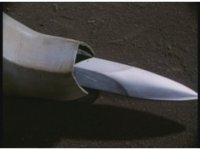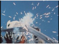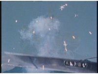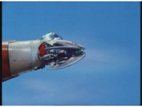 In Pyramidas cockpit, Gold raises fists, spreads arms forth, then touches control table. |