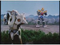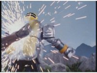 Cruel Chrome shoots off a grappling hook from his right arm, latching onto Super Zeo Megazord's chest with a superimposed burst. |