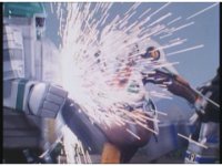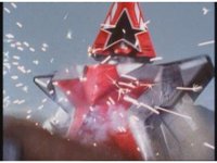 Upward side angle on Cruel Chrome spark bashing Super Zeo Megazord with boomerang. |