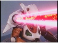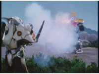 Cruel Chrome staggers back, then bends forth, firing beam from back cannon explosively into Super Zeo Megazord. |