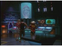 Zordon superimposed in his Power Chamber plasma tube above Kat, Jason & Alpha. |