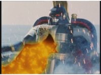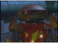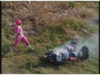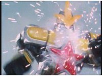 Zoom in on Super Zeo Megazord cockpit, spark and smoke bursting, Red nod-talks and presses button. |