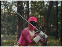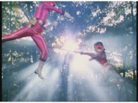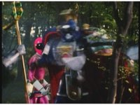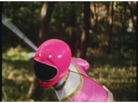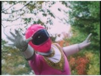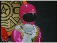 Kat calls for Zeo Ranger 1, Pink, as said color energy flashes about, a green grid overlaying on her body. Briefly, we cut to an outstretched arm morphing into a gloved Zeo Ranger hand. Cut back to Kat, as the rising energy covers her completely, becoming the Pink Zeo Ranger, visor and costume circuits shimmering with power. |