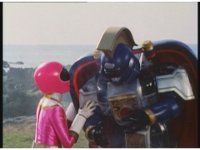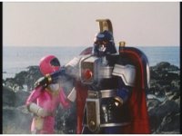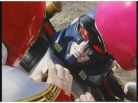 Sharp zoom in on Pink in Super Zeo Megazord cockpit, standing up and nod-talking with a raised fist to our slight right. |