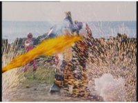 Beam strikes near the Rangers, dust bursting them away. |
