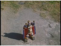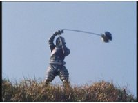 Push in, upward angle, on Auric the Conquerer, lowering raised arms, in triumph. |