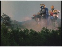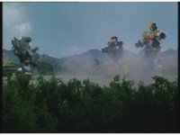 Against a cloudy backdrop, Super Zeo Megazord bowls Warrior Wheel forth, it rolls for a bit before springing upward into warrior form. |