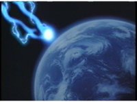 Facing Earth cut-out, King Mondo aims wand at it and fires twin beams of bluish electricity at it. |