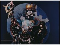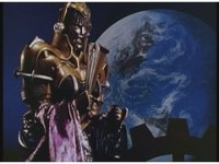 Close on King Mondo, by Earth cut-out's edge, talking at us, motioning left arm about as he speaks. |