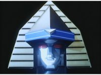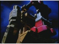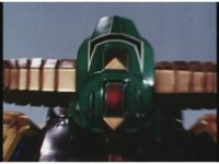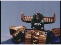 Close-up on Zeo Megazord's head as the Zeo One Battle Helmet slides down over it, flashing happening just off-frame. |