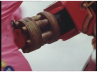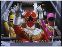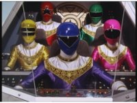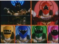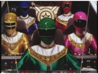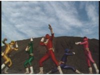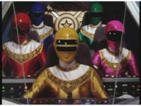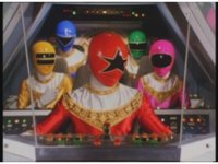 In Megazord cockpit, as, all together, the five Zeo Rangers cross their wrists, spread arms around in a circle and raise their right arms forth and up for a moment, before grabbing controls. |