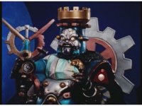 After a pan over his detailed working gears, upward on Cog-Changer, lowering saw arm. |