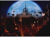 Far exterior of the Machine Empire Skybase against the profile of the Earth. In the distance, Gearships hovering about, exhaust pipes spewing balls of fire into the atmosphere. |