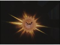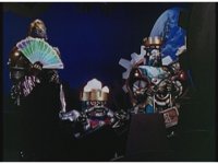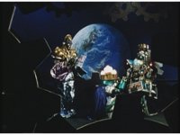 Stepping in from our right, facing our left in front of Earth cut-out, King Mondo talks, turning more forward as he motions left hand about, briefly lifting staff. |