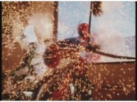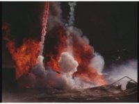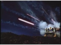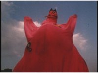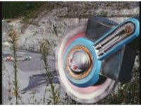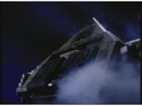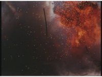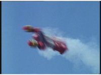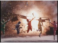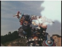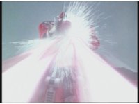 Red Battlezord is launched from cannon at Zord hangar, into a speeding twirl through the sky. |