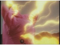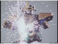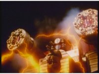 Against black backdrop, Zeo MegaBattlezord's shoulder fist-cannons piston in and out, crackling with yellow electricity and shimmering, before firing energy blasts forth. |