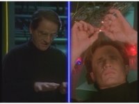 Billy is working on wires under console when his face begins to distort, prompting him to get up. |