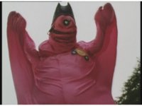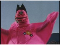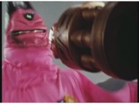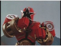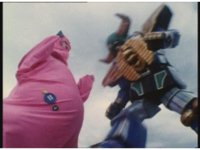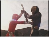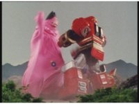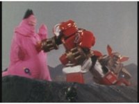 Red Battlezord repeatedly punches Impursonator, stopping after realizing the ineffectualness of its fists. |