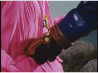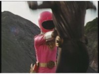 Kat calls for Zeo Ranger 1, Pink, as said color energy flashes about, a green grid overlaying on her body. Briefly, we cut to an outstretched arm morphing into a gloved Zeo Ranger hand. Cut back to Kat, as the rising energy covers her completely, becoming the Pink Zeo Ranger, visor and costume circuits shimmering with power. |