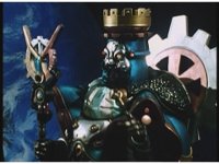 Track right and zoom out, as Klank strolls across the Skybase balcony with Orbus on his arm, over to the Royal Family of the Machine Empire, bowing down and kneeling before them. |