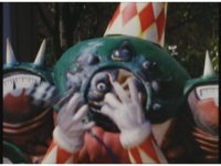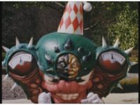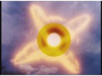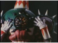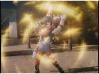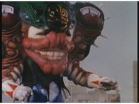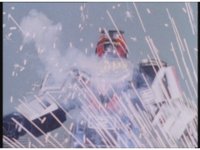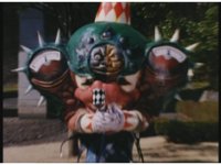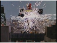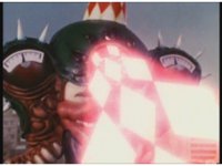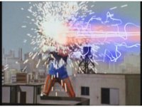 Zoom out, as Turbo Megazord's chest headlights come on, a quick motioning of the arms and the headlights fire a reddish beam with blue electricity forth, slamming into Mouthpiece with spark bursting. |