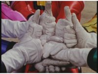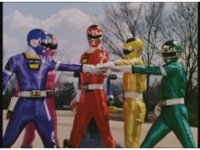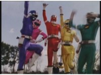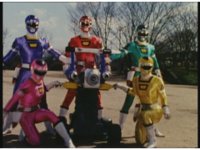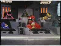 Side angle in Megazord cockpit, as the five Rangers all speak in unison. |