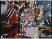 As Turbo Megazord remains with its back to the monster while partially in frame, Mouthpiece violently spark bursts behind it. |