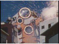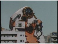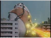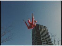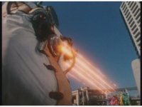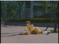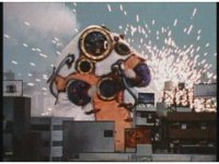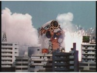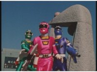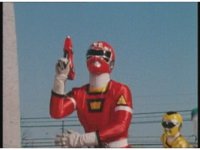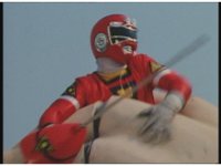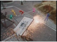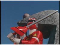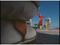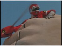 Cuts follow-up individual Ranger posings sequence, and shot of Red looking up at Porto smashing at buildings. |