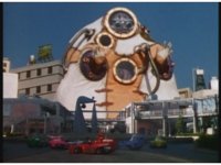 The five Rangers pull up and park their Turbo Carts, below a clear view of giant Porto. |