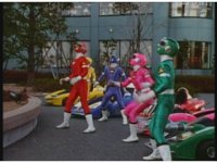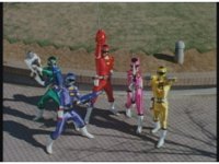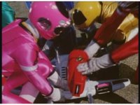 The Rangers strip Turbo RAM for parts, then pose with their Turbo Weapons. |