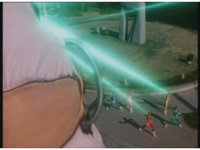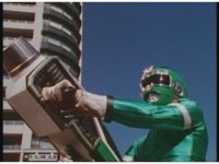 The Rangers roll to safety, then whip out their Auto Blasters, firing green beams upon Porto, which he laughs off. |