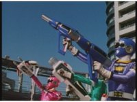 Pink, Green, & Blue Rangers aim their Turbo Weapons, firing upon Porto. |