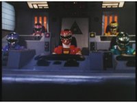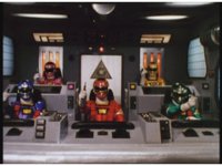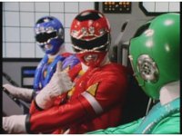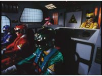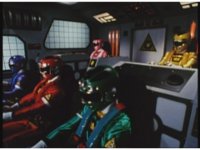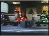Side angle in Megazord cockpit, as the five Rangers all speak in unison. |