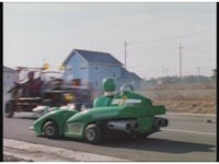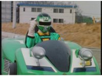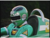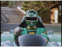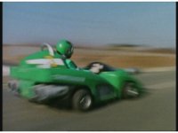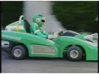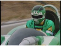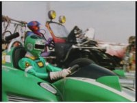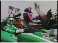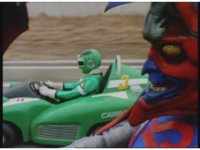 Demon Racer II motions arms about, ready to attack, when he freezes, then turns around to see Green Ranger posing before his Turbo Cart in the near distance. |