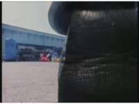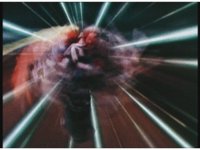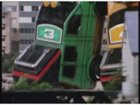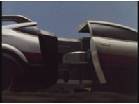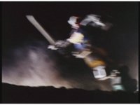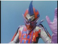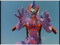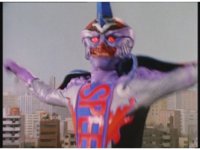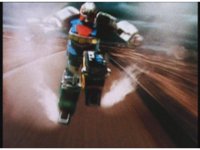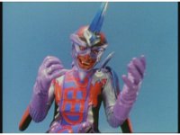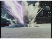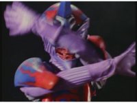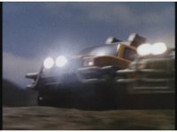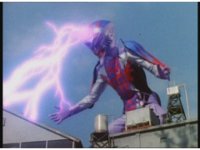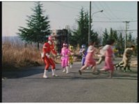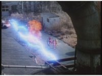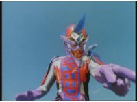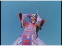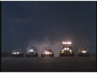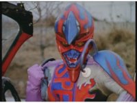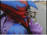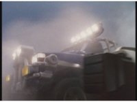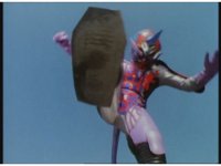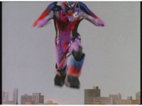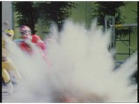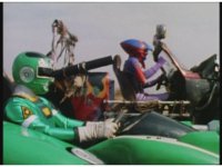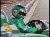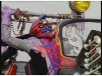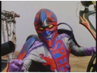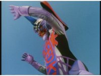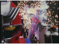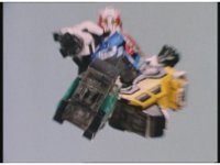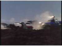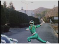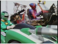Standing up, Demon Racer II heads off to our right after his prey, pan left to the other four Rangers, fist raising then rushing off to our left. |
