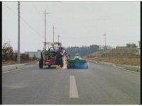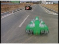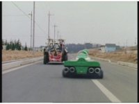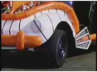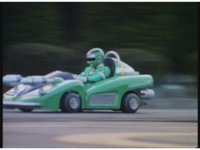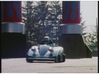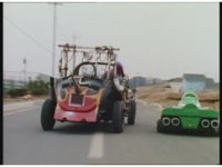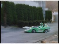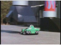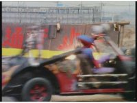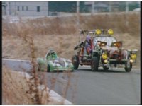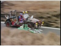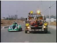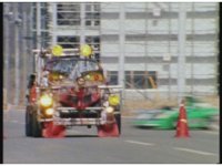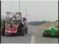 Demon Racer turns and crashes through cones, Green following close behind, before finally pulling up alongside him. Demon Racer swerves repeatedly, trying to knock the Turbo Cart off the road, to no avail. |