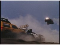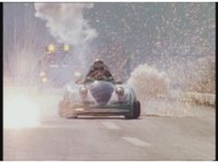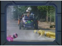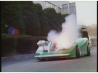 Demon Racer II starts up his car again, driving at the fleeing Rangers while firing off beams that cause fire bursts about. |